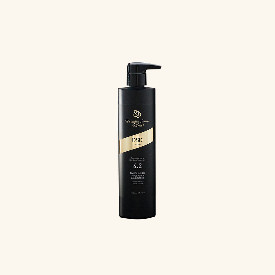 DIXIDOX DE LUXE TRIPLE ACTION CONDITIONER. The conditioning treatment helps restore, nourish, and protect hair while helping to stimulate its growth. Its formula is based on shea butter, hydrolyzed collagen, keratin, and Aloe vera, and a high concentration of panthenol helps to strengthen and restructure the hair fiber. As hair growth stimulating ingredients it contains a unique protein-mineral complex, trace elements such as zinc, iron, silicon, and magnesium, and a multivitamin complex that includes antioxidants and stimulators such as vitamins A, C, E, PP, riboflavin, biotin, inositol, thiamine, pyridoxine, and nicotinamide. It also contains sabal extract. Indicated for fragile and damaged hair. The result is shiny, soft, and more manageable hair, facilitating styling.