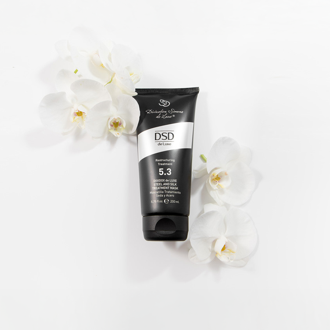 DIXIDOX DE LUXE STEEL AND SILK TREATMENT MASK. The Mask helps to restore the structure of the hair damaged by the exposure of the hair to harmful external agents; environmental, thermal, and chemical, including hair dyeing and sun exposure. The active ingredients: phospholipids, sphingolipids, orchid extract, hydrolyzed keratin, hydrolyzed silk, lanolin, yeast extract, and vitamins allow to restore the structure of the hair at the level of the cuticle and the keratin fibrils of the cortex layer. After using the mask, the hair acquires an extra volume, is more hydrated, and shiny, a healthy and radiant appearance.